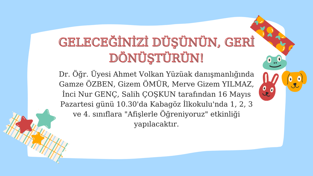 Geleceğinizi düşünün,geri dönüştürün! projesi kapsamında geri dönüşüm ile ilgili görsel ve sloganların yer aldığı iki afiş ile bilgilendirme yapılacaktır. Dr. Ögr. Üyesi Ahmet Volkan YÜZÜAK danışmanlığında gerçekleşecek “Afişlerle Öğreniyoruz” adlı etkinliğin sunumu Gizem ÖMÜR, Gamze ÖZBEN, İncinur GENÇ, Merve Gizem YILMAZ ve Salih COŞKUN tarafından Kabagöz İlkokulu’nda 1,2,3 ve 4. sınıflara 16.05.2022 tarihinde 10.30-11.30 saatleri arasında gerçekleştirilecektir.