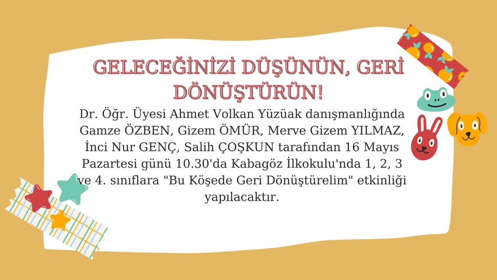 Geleceğinizi düşünün,geri dönüştürün! projesi kapsamında geri dönüşüm ile ilgili yapılan bilgilendirmelerin görselleştirilmesi amacıyla sınıfta panoya geri dönüşüm köşesi hazırlanacaktır. Dr. Ögr. Üyesi Ahmet Volkan YÜZÜAK danışmanlığında gerçekleşecek “Bu Köşede Geri Dönüştürelim” adlı etkinlik Gizem ÖMÜR, Gamze ÖZBEN, İncinur GENÇ, Merve Gizem YILMAZ ve Salih COŞKUN tarafından Kabagöz İlkokulu’nda 1,2,3 ve 4. sınıflara 16.05.2022 tarihinde 10.30-11.30 saatleri arasında gerçekleştirilecektir.