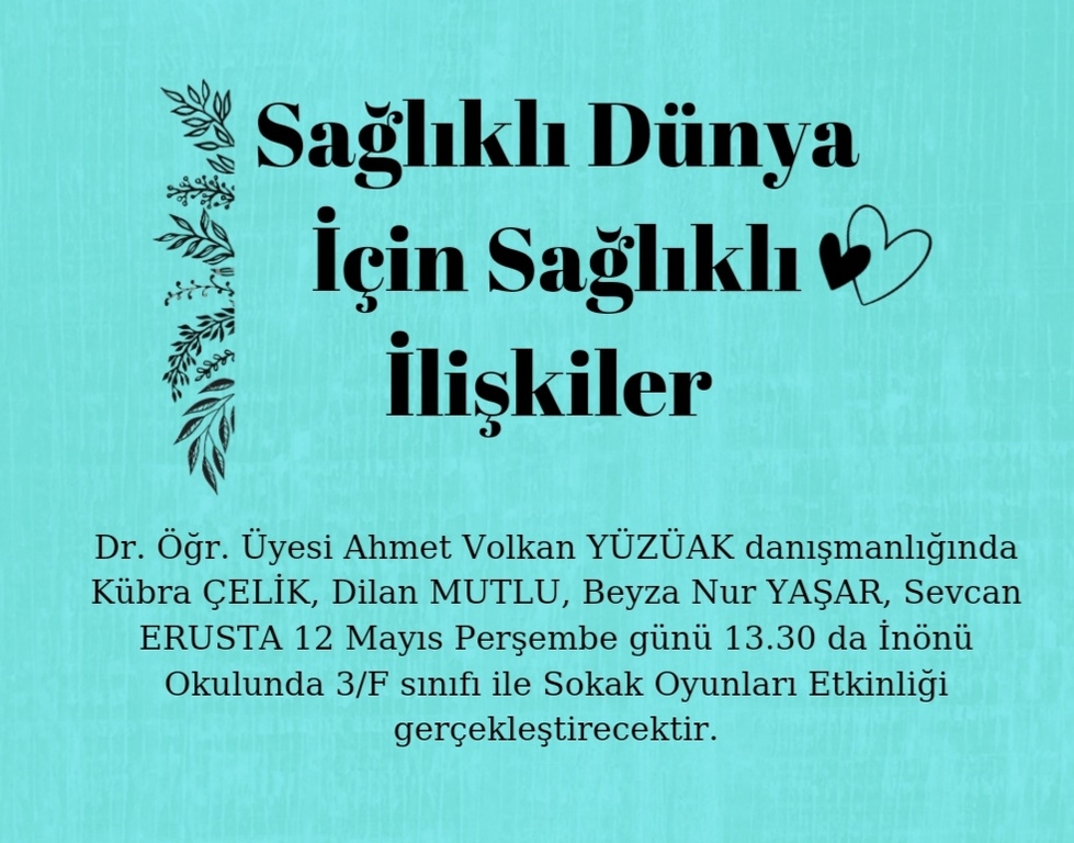 Sağlıklı Dünya İçin Sağlıklı İlişkiler projesi altında Dr. Öğr. Üyesi Ahmet Volkan YÜZÜAK danışmanlığında Kübra ÇELİK, Dilan MUTLU, Beyza Nur YAŞAR, Sevcan ERUSTA 12 Mayıs Perşembe günü 13.30 da İnönü Okulunda 3/F sınıfı ile Çark Oyunu Etkinliği gerçekleştirecektir.