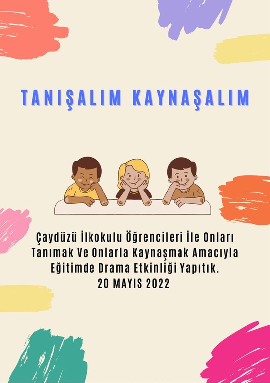 Teknoloji Çocuklarını Geçmişe Götürüyoruz projesi altında Dr. Öğr. Üyesi Ahmet Volkan YÜZÜAK danışmanlığında Gökçe ÖZVEREN, Betül TURAN, Melike ULUCAN ve Zekeriya MATA 20 Mayıs Cuma günü 15.00 da Çaydüzü İlkokulu 2/C sınıfı öğrencileri ile onları tanımak ve onlarla kaynaşmak amacıyla eğitimde drama etkinliği gerçekleştirecektir.