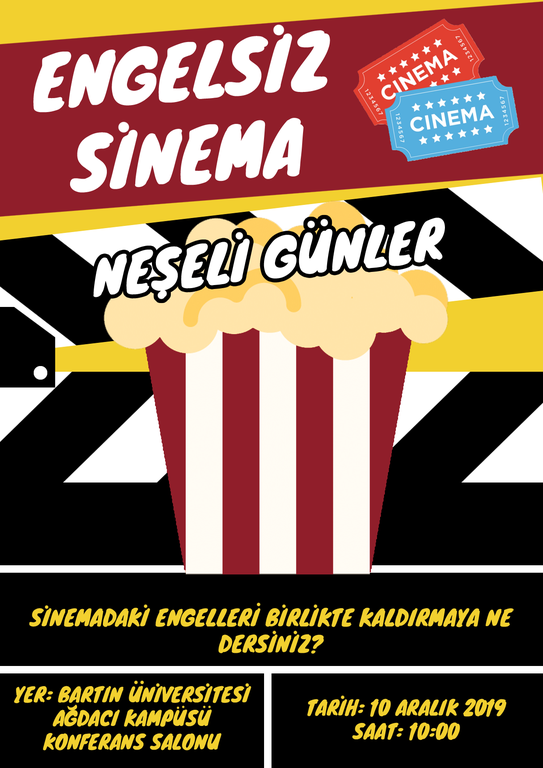 Topluma Hizmet Uygulamaları Dersi'nde  Rehberlik ve Psikolojik Danışmanlık Lisans programı 4. sınıf öğrencilerinin ''Engelsiz Sinema'' projesi kapsamında görme ve işitme engellilere yönelik sesli betimleme, altyazı ve işaret dili teknikleriyle hazırlamış oldukları ''Neşeli Günler'' filmi 10.12.2019 Salı günü saat 10:00'da Ağdacı Kampüsü Konferans Salonunda gösterime sunulacaktır.