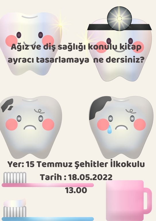 Ağız ve diş sağlığı ile ilgili kitap ayracı yapmaya ne dersiniz? Dr. Öğr.Üyesi Ahmet Volkan Yüzüak danışmanlığında, grup koordinatörü Fatma Demir, Ezgi Nur Kılıç, Şükran Nur Sakioğlu, Cemile Dursun ve Oktay Usluer,12 Mayıs 2022 Perşembe günü saat 13.00 da ağız ve diş sağlığı ile ilgili 1.sınıf öğrencileriyle kitap ayracı hazırlanacaktır.Sizleri de aramızda görmekten mutluluk duyarız.
