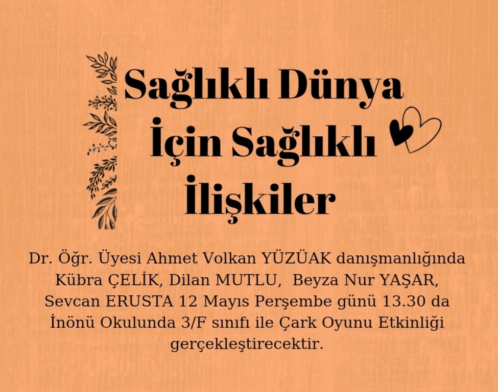 Sağlıklı Dünya İçin Sağlıklı İlişkiler projesi altında Dr. Öğr. Üyesi Ahmet Volkan YÜZÜAK danışmanlığında Kübra ÇELİK, Dilan MUTLU, Beyza Nur YAŞAR, Sevcan ERUSTA 12 Mayıs Perşembe günü 13.30 da İnönü Okulunda 3/F sınıfı ile Sokak Oyunları Etkinliği Etkinliği gerçekleştirecektir.