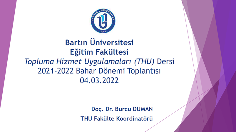 Topluma Hizmet Uygulamaları Komisyonu 2021-2022 yılı bahar dönemi toplantısı fakülte ve bölüm koordinatörleri ile Topluma Hizmet Uygulamaları dersi veren öğretim elemanlarının katılımıyla 4 Mart 2022 saat 14.00'da gerçekleştirilmiştir. Toplantıda, Topluma Hizmet Uygulamaları dersinin ve ders kapsamındaki projelerin nasıl yürütüleceğine dair bilgilendirmeler yapılmıştır.