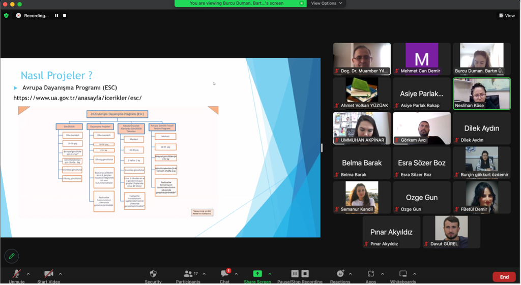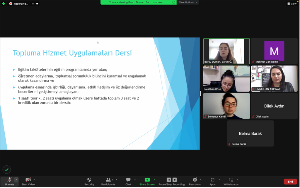 Topluma Hizmet Uygulamaları Komisyonu 2022-2023 akademik yılı bahar dönemi toplantısı fakülte ve bölüm koordinatörleri ile Topluma Hizmet Uygulamaları dersi veren öğretim elemanlarının katılımıyla 17 Mart 2023 saat 11.30'da gerçekleştirilmiştir. Toplantıda, Topluma Hizmet Uygulamaları dersinin ve ders kapsamındaki projelerin nasıl yürütüleceğine dair bilgilendirmeler yapılmıştır.